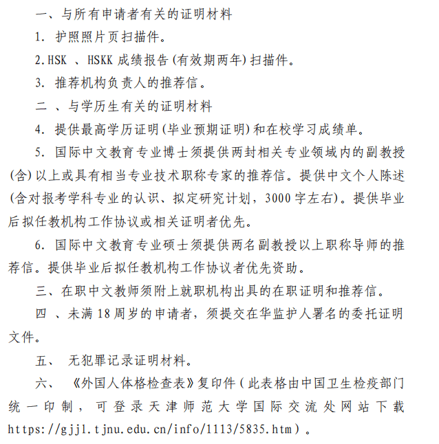 国际中文教育方向,汉语考试成绩达到 HSK(三级)270分,具有 HSKK 成绩;汉语言文学方向,汉语考试成绩达到 HSK(四级)180分、HSKK(中级)60分;汉语研修方向,汉语考试成绩达到 HSK(三级) 210分,提供 HSKK 成绩者优先。