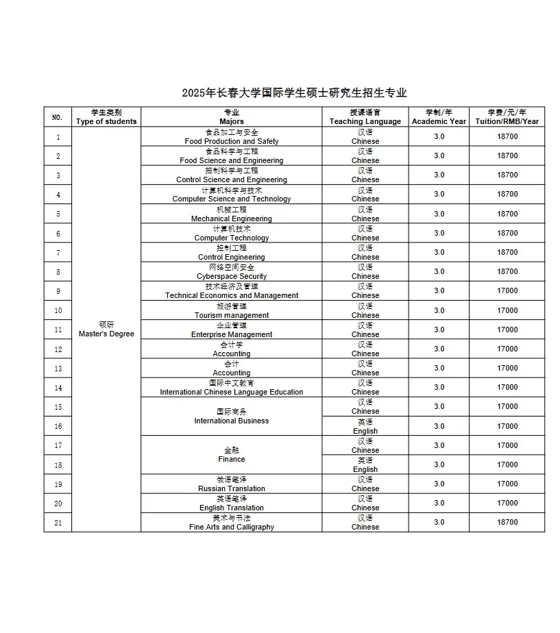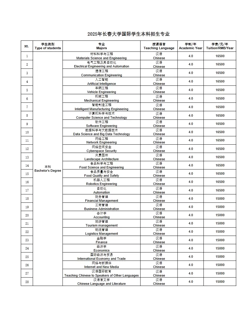 1.招生专业:请参阅《长春大学2025年国际学生招生专业目录》